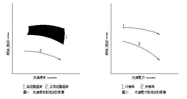 圖二表示增加充填壓力可以減少流紋的情形,這在高模溫時(shí)最有效.消除流紋是一件費(fèi)力而不易見效的事,最好是避免產(chǎn)生氣泡的根本原因,如此就不必再要求消除流紋了.對(duì)有待電鍍或油漆的塑件,或者將浸泡在熱水或溶劑中的塑件,就毋需采用消除流紋的方法.