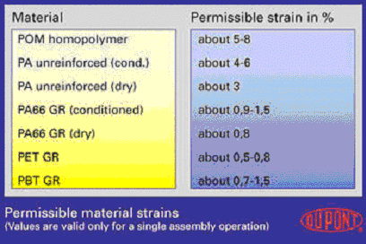 在所有這些卡扣設(shè)計(jì)中,設(shè)計(jì)者必須確保配件的幾何尺寸,避免應(yīng)力松弛引起裝配部件松動(dòng)。