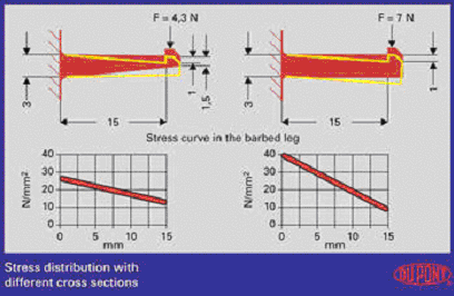 在倒鉤型卡扣裝配中,尖的倒鉤尖端可以減小倒鉤變形時(shí)的應(yīng)力(見圖2),這種設(shè)計(jì)能夠使應(yīng)力在整個(gè)倒鉤彎桿部分均勻分散。倒鉤基部的應(yīng)力集中相對(duì)減小。裝配壓力也有相當(dāng)程度的減少。
