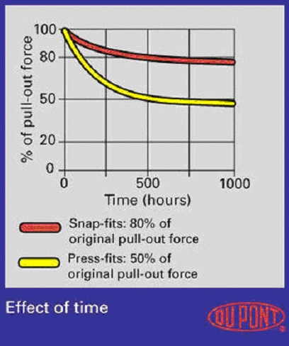 壓件裝配可以使塑料組件在最低的成本下進(jìn)行高強(qiáng)度裝配。例如對(duì)卡扣裝配來說,由于應(yīng)力松弛,高壓裝配的拉力強(qiáng)度隨著時(shí)間的流逝而減少(見圖3)。設(shè)計(jì)計(jì)算必須把它考慮進(jìn)去。另外,必須作使用溫度周期變化的試驗(yàn),以保證設(shè)計(jì)的可行性。