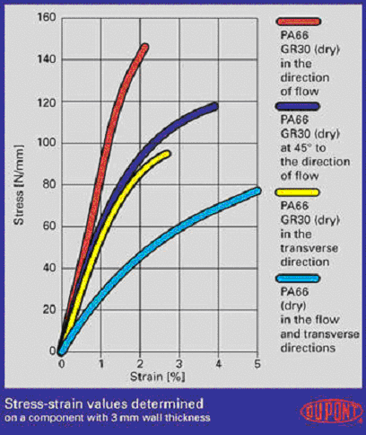 在注射成型過程中,長鏈的塑料分子、纖維填料和增強(qiáng)材料的取向主要由熔融塑料的流動(dòng)方向決定,這導(dǎo)致了部件性能對方向的相關(guān)性(各向異性)。例如,流動(dòng)方向上的伸展性能比垂直方向上的伸展性能要好得多(見圖1)。含有纖維增強(qiáng)材料的部件所受到的影響比不含纖維增強(qiáng)材料的部件要大得多。纖維的取向也引起部件在水平和垂直方向上的收縮差異,這將異致部件發(fā)生翹曲。