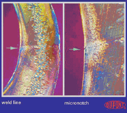當(dāng)模具中2條或更多的熔流會聚到一起時(shí),就會產(chǎn)生熔合線。例如,在熔體需要流經(jīng)嵌件,或制品同時(shí)在幾點(diǎn)進(jìn)行澆注時(shí),就會出現(xiàn)熔合線(見圖2a和2b)。而且,同一制品中不同的壁厚可能導(dǎo)致熔體前方分離,從而產(chǎn)生熔合線。當(dāng)應(yīng)從模具中排除的空氣被熔體封閉在模具中無法溢出時(shí),就會產(chǎn)生空氣存集(出現(xiàn)氣泡)。熔合線和空氣存集通常被作為表面缺陷的表現(xiàn)。除了會使表面難看外,它們還會明顯降低受影響區(qū)域的機(jī)械性能,特別是沖擊強(qiáng)度(見圖3和圖4)。