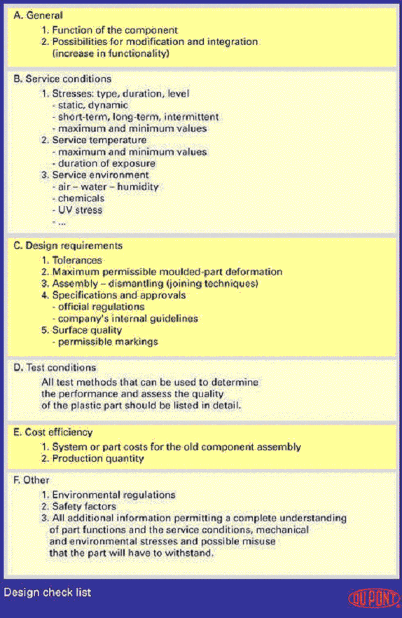 塑料的性質(zhì)受使用環(huán)境、加工過(guò)程、模具設(shè)計(jì)和操作條件的影響(如圖1所示)。塑料性質(zhì)由實(shí)驗(yàn)室環(huán)境下的測(cè)試得到。測(cè)試圖由具有優(yōu)化參數(shù)的高光度模具,在規(guī)定壓力的標(biāo)準(zhǔn)條件下檢測(cè)產(chǎn)生的。然而,實(shí)際上,塑料不可能恰好在這樣的條件下生產(chǎn),在使用中也不可能正好在同樣的壓力下。因此,在推出任何塑料設(shè)計(jì)方案的時(shí)候,其精確的要求和界定條件必須仔細(xì)地分析和羅列出來(lái),設(shè)計(jì)核對(duì)表在這方面可以提供有用的幫助。