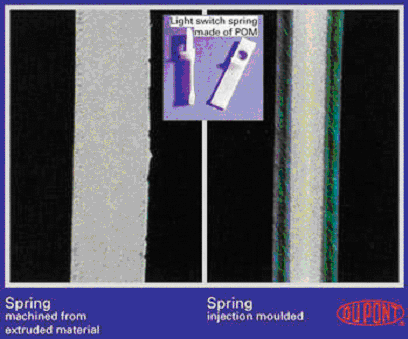 由擠出材料制成的用于電燈開關(guān)的樣品,可以承受180000次周期性應(yīng)力。而同樣情況下,注塑部件在80000次之后就出現(xiàn)了疲勞破壞。這種差異是由于在注塑過(guò)程中晶體結(jié)構(gòu)的不同所造成的。