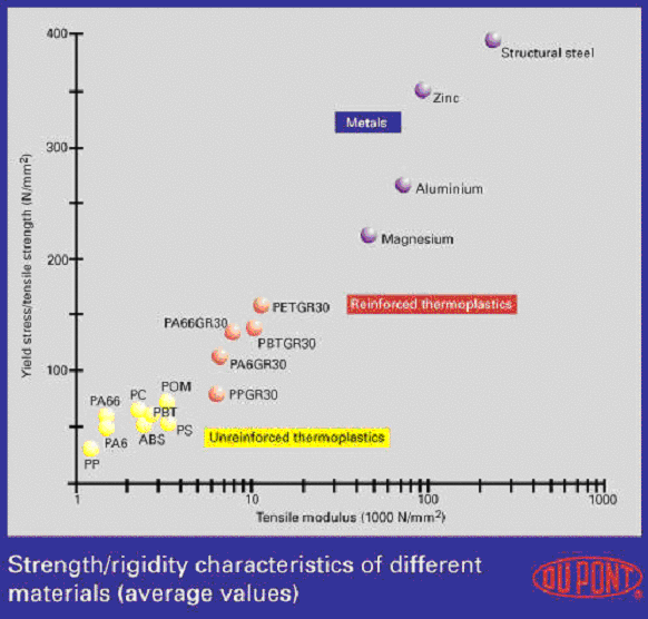 塑料原材料比起其他任何工業(yè)原材料,其特性可在很大的范圍內(nèi)變化多端。通過(guò)添加填料、增強(qiáng)材料和改性劑,其性質(zhì)會(huì)產(chǎn)生很大的轉(zhuǎn)化。大多數(shù)塑料的基本性質(zhì)與金屬有著明顯區(qū)別。例如,通過(guò)直接對(duì)比,金屬具有更高的。