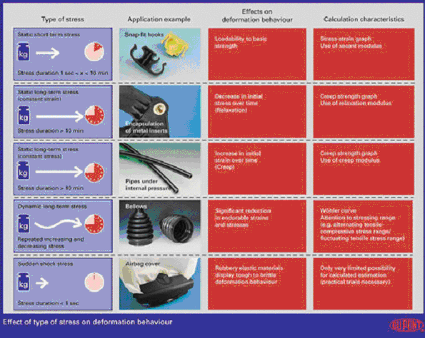 如果使用溫度與形變率變化很大,工程熱塑性塑料的性質(zhì)也可以由硬脆向彈性變化。例如,安全氣袋張開(kāi)門(mén),在實(shí)際應(yīng)用(如爆炸性開(kāi)啟)的過(guò)程中,其形變表現(xiàn)與慢速組裝配件的形變表現(xiàn)質(zhì)完全不同(如圖2)。同樣的,卡扣配件也必須隨著溫度的冷熱來(lái)選擇不同的裝配方法。這里,溫度的影響遠(yuǎn)遠(yuǎn)大于裝載速率的影響。