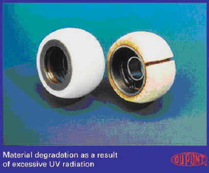 塑料的特性不僅僅是純?cè)牧系男再|(zhì)。在不同操作環(huán)境下,塑料組件的基本性質(zhì)會(huì)隨著不同的因素而改變(如紫外光輻射,如圖3)。如果原材料在不適用的范圍內(nèi)加工,再好的設(shè)計(jì)也會(huì)失敗。同樣的,制品并不能以加工過(guò)程來(lái)解決設(shè)計(jì)弱點(diǎn)。因此只有考慮到所有因素的優(yōu)化工藝,才能保證塑料零部件的質(zhì)量。