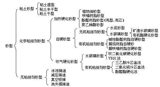 鑄造主要工藝過(guò)程包括:金屬熔煉、模型制造、澆注凝固和脫模清理等。鑄造用的主要材料是鑄鋼、鑄鐵、鑄造有色合金(銅、鋁、鋅、鉛等)等。鑄造方法常用的是砂型鑄造,其次是特種鑄造方法,如:金屬型鑄造、熔模鑄造、石膏型鑄造......等。而砂型鑄造又可以分為粘土砂型、有機(jī)粘結(jié)劑砂型、樹(shù)脂自硬砂型、消失模等等,如下圖: