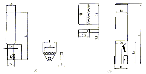 機(jī)夾螺紋銑刀適用于較大直徑(如D>25mm)的螺紋加工。其特點(diǎn)是刀片易于制造,價(jià)格較低,有的螺紋刀片可雙面切削,但抗沖擊性能較整體螺紋銑刀稍差。因此,該刀具常推薦用于加工鋁合金材料。圖3 所示為兩種機(jī)夾螺紋銑刀及刀片。圖3a為機(jī)夾單刃螺紋銑刀及三角雙面刀片,圖 3b為機(jī)夾雙刃螺紋銑刀及矩形雙面刀片。