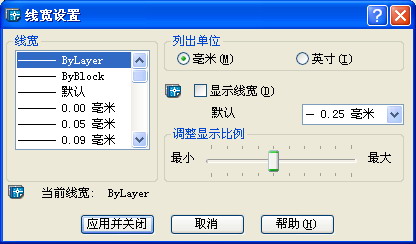 單擊“線寬設(shè)置”按鈕將彈出“線寬設(shè)置”對(duì)話框。用此對(duì)話框可以設(shè)置線寬的顯示特性和缺選項(xiàng),同時(shí)還可以設(shè)置當(dāng)前線寬,如圖12所示。
